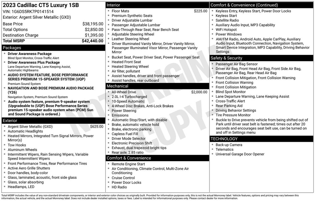 Certified. 2023 Cadillac CT5 Luxury Argent Silver Metallic AWD 10-Speed Automatic 2.0L I4 Turbocharged DOHC 16V LEV3-SULEV30 237hp