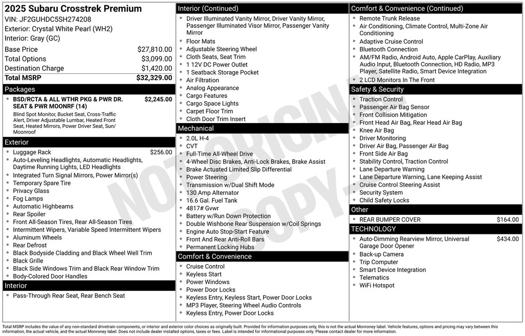 The Crosstrek Premium's striking exterior design and refined interior create a harmonious blend of style and substance. Enjoy the convenience of the Power Moonroof, the added security of the Auto-Dimming Mirror with Compass and HomeLink, and the versatility of the Aero Crossbar Set â" all seamlessly integrated to elevate your driving experience.